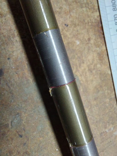 Repainting the rod was no issue, the paint flaking off easily but of course that can't be done close to the butt transfers. So my newly refurbished rod ended up a beautiful silver grey with purple and black whippings with transfers on small islands of dark green.
